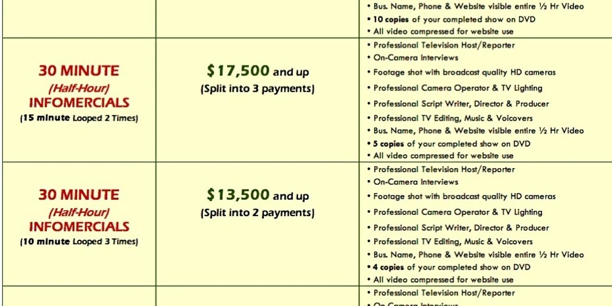 5 Star Media Productions produces television commercials (30 second spots), half-hour infomercials, live televised fashion events, website videos, YouTube videos, and much more. We can air your 30 second commercial throughout your immediate area (city) for as low as $25 (twenty five) dollars per airing on many major networks such as: MTV, Lifetime, CNN, Fox News Channel, History Channel, E!, CNBC, A&E, TLC, Bravo, ESPN, Discovery Channel, MSNBC, HGTV, Oxygen, WE, Food Network, Spike TV, ABC Family, VH1, BET, Fox Sports Net, and many others. We can also air your very own half hour infomercial in any city in the nation for under $1,500 --- Below are some of the network channels you can air on!